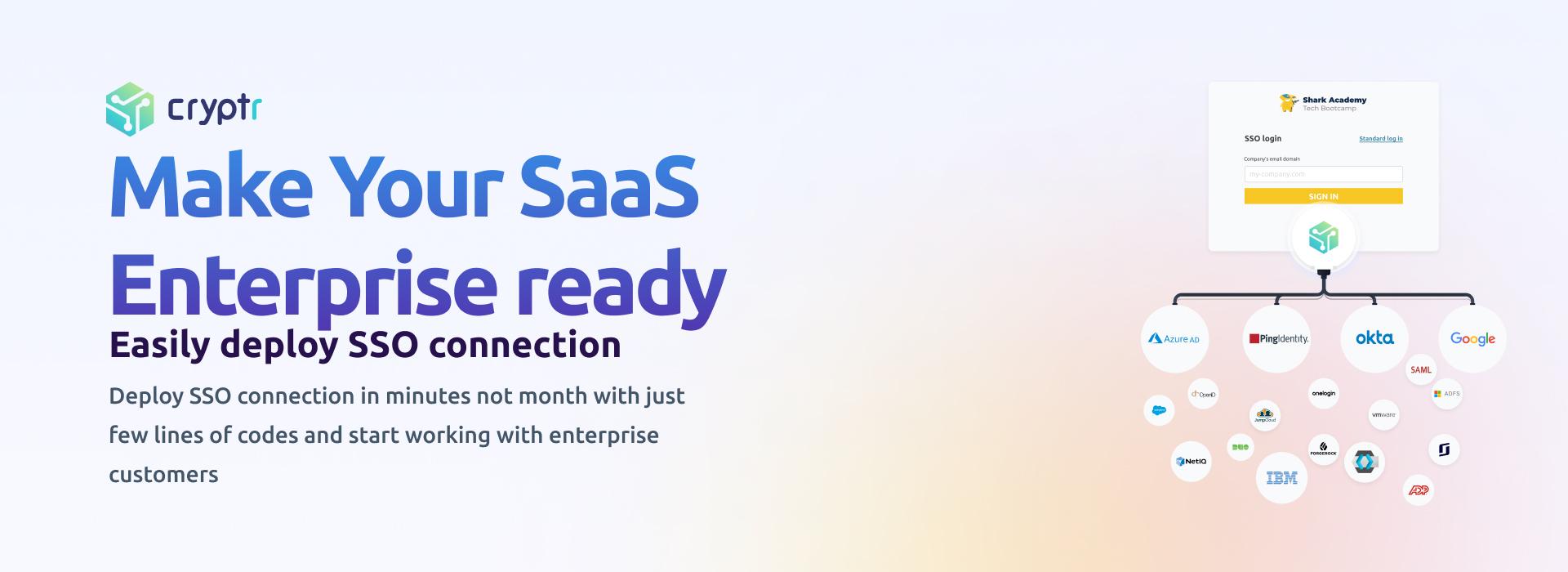 Cryptr simplifica el complejo proceso de integración con los sistemas de autenticación SSO de los clientes empresariales. Gracias a su conector SSO universal, las empresas SaaS pueden conectarse rápidamente a los sistemas SSO de sus clientes, ya sean protocolos como SAML o proveedores de identidad como Azure AD, Okta, Ping Identity, etc. Esta integración rápida y fiable te permite:
